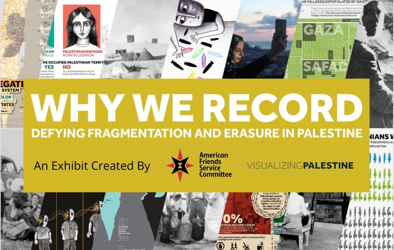 Why We Record: Defying Fragmentation and Erasure in Palestine: A visual exhibit from American Friends Service Committee and Visualizing Palestine exploring the truths of the past, the heartbreak of the present, and the possibilities for a future without oppression in Palestine.