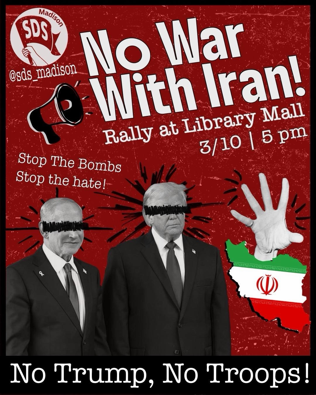 Categories Uncategorized UW Madison, March 10, 2026: No U.S.-Israel War With Iran! Post author By WiBOPM Post date March 9, 2026 Share this: Share on X (Opens in new window) X Share on Facebook (Opens in new window) Facebook Like Loading... Related ← Manitowoc, March 12, 2026: No Nazis! No Hate! Rally & Community Gathering