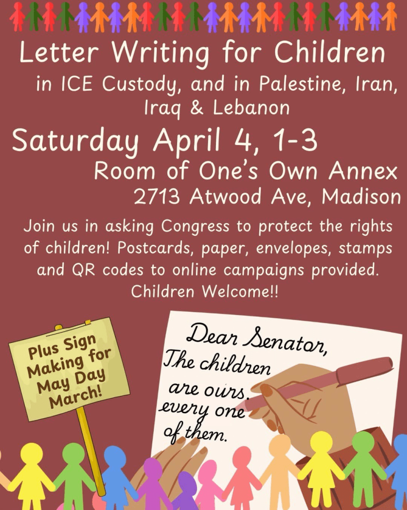 Categories Uncategorized Madison, April 4, 2026: Letter Writing for Children in ICE Custody and in Palestine, Iran, Iraq and Lebanon Post author By WiBOPM Post date March 18, 2026 Share this: Share on X (Opens in new window) X Share on Facebook (Opens in new window) Facebook Like Loading... Related ← Madison, March 29, 2026: Rally for Transgender Rights & Visibility! → Trump’s Iran war: Washington starts it, allies made to pay