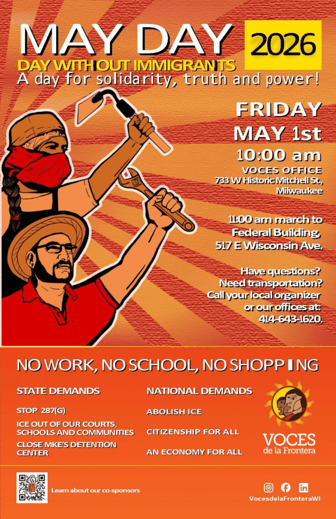 Categories Uncategorized Milwaukee, May Day 2026! Post author By WiBOPM Post date March 18, 2026 Voces de la Frontera Share this: Share on X (Opens in new window) X Share on Facebook (Opens in new window) Facebook Like Loading... Related ← LaFarge, WI, April 18, 2026: Sacred Water, Sacred Land! Reconnecting With All that Sustains Us, Love the Earth! → Help Break the Murderous U.S. Blockade On Cuba!