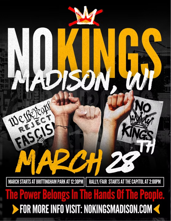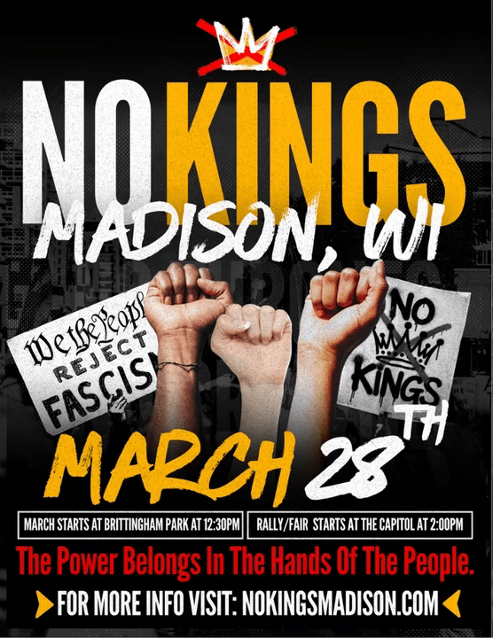 Categories Uncategorized Madison: No Kings! No Billionaires! March 28, 2026 Post author By WiBOPM Post date March 23, 2026 Share this: Share on X (Opens in new window) X Share on Facebook (Opens in new window) Facebook Like Loading... Related ← Madison: Union Peacekeeping During Troubling Times April 1, 2026 → Vote April 7, 2026 (Information)