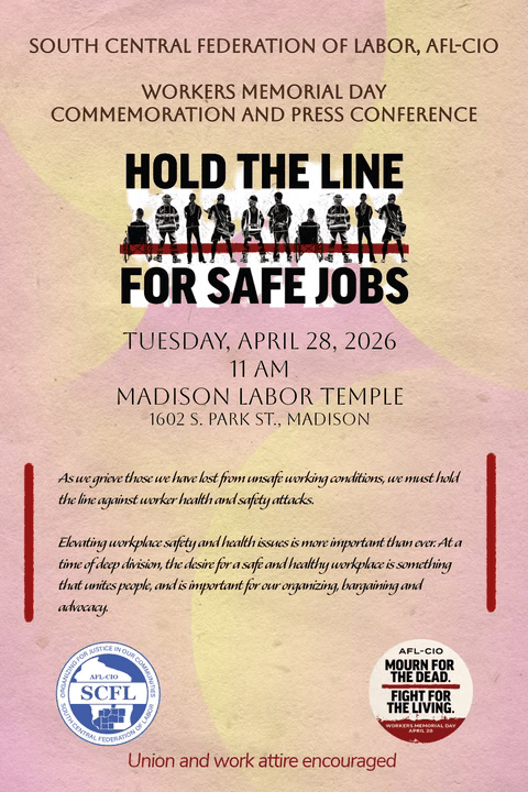 Categories Uncategorized Madison: Workers Memorial Day Commemoration & Press Conference April 28, 2026 Post author By WiBOPM Post date March 23, 2026 https://www.scfl.org/ Share this: Share on X (Opens in new window) X Share on Facebook (Opens in new window) Facebook Like Loading... Related ← Letter Carriers Union Stamp Out Hunger Food Drive May 9, 2026 → Madison: Union Peacekeeping During Troubling Times April 1, 2026