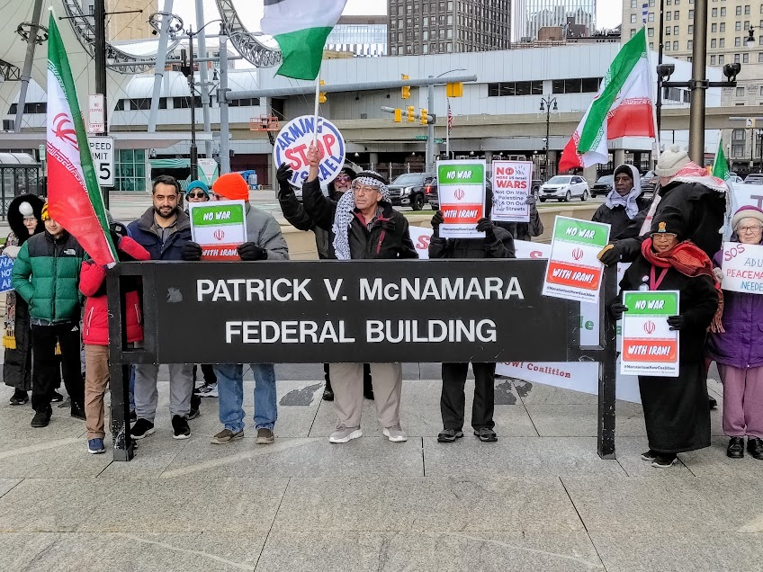 On Mon. March 24, 2026, members of the Moratorium NOW! Coalition, the Anti-Fascist Organizing Coalition, Michigan Emergency Committee Against War & Injustice and others gathered outside the McNamara Federal Bldg. in downtown Detroit to express their concern over the continuing threats to world peace and the impact of the aggression on the economy of the U.S. and internationally.
