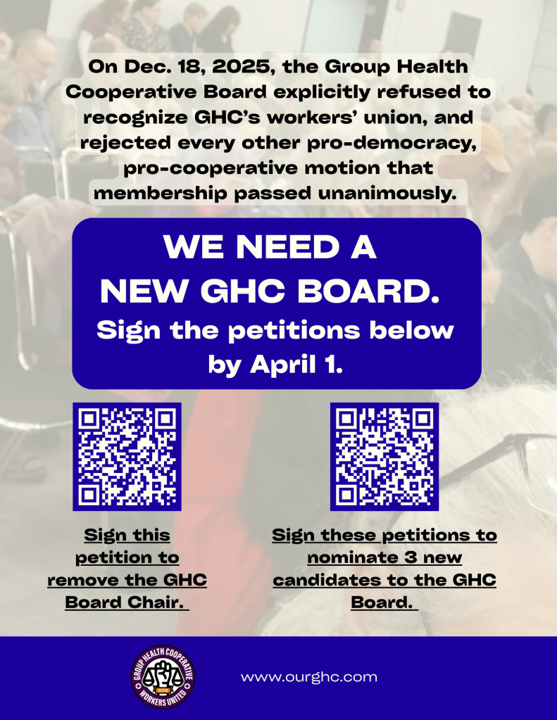 Group Health Cooperative’s Board has openly refused to recognize GHC’s workers’ union, despite a unanimous membership vote in October directing them to do so. We need to hold Board leadership accountable and send a message that the cooperative is run by its members.