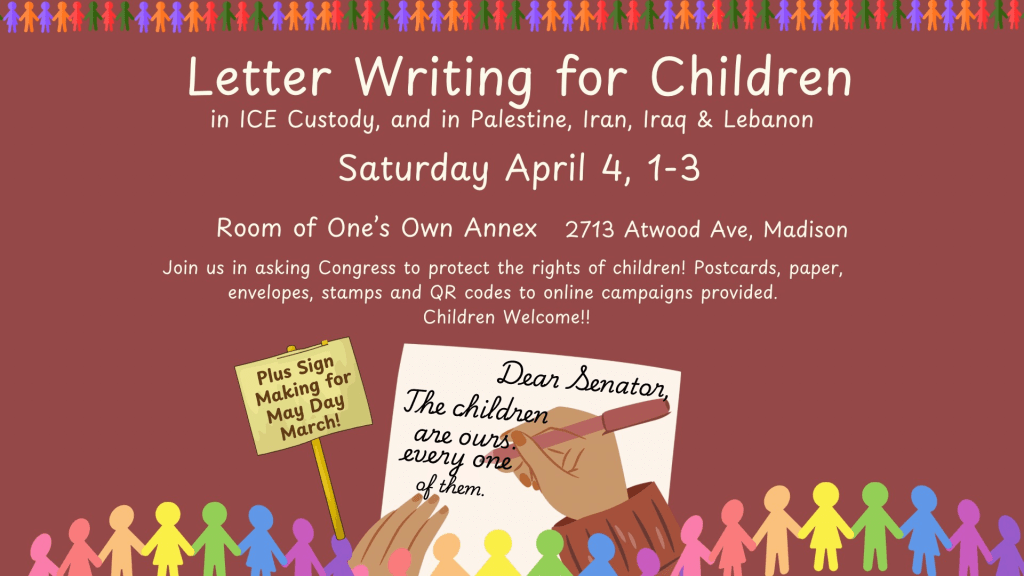 You are invited to an afternoon of letter writing to elected officials in support of the human rights of children, asking them to take action to protect children in ICE custody, in Israeli detention, and impacted by the US/Israeli war in Lebanon, Iran and Iraq. Plus sign making in preparation for the Voces de la Frontera May Day event. Stamps, paper, postcards, congressional addresses, online campaigns, sample letters, posterboard and art supplies will be available, and children are welcome at this event.