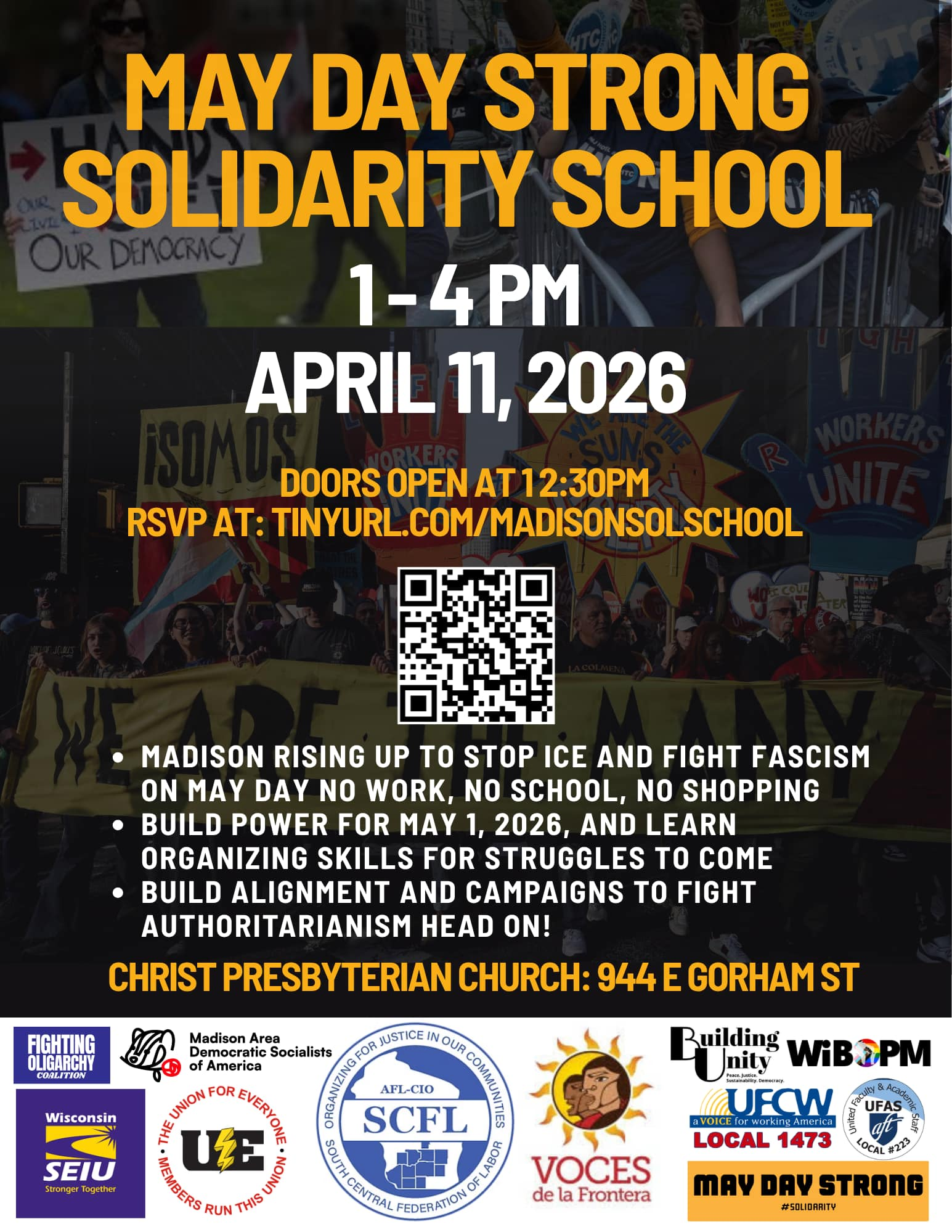 Categories Uncategorized Madison: May Day Strong Solidarity School April 11, 2026 Post author By WiBOPM Post date April 6, 2026 Share this: Share on X (Opens in new window) X Share on Facebook (Opens in new window) Facebook Like Loading... Related ← May Day call grows for ‘No work, no school, no shopping’ → Premature Babies Evacuated After Israeli Attack on Al-Shifa Returned to Gaza After More Than Two Years