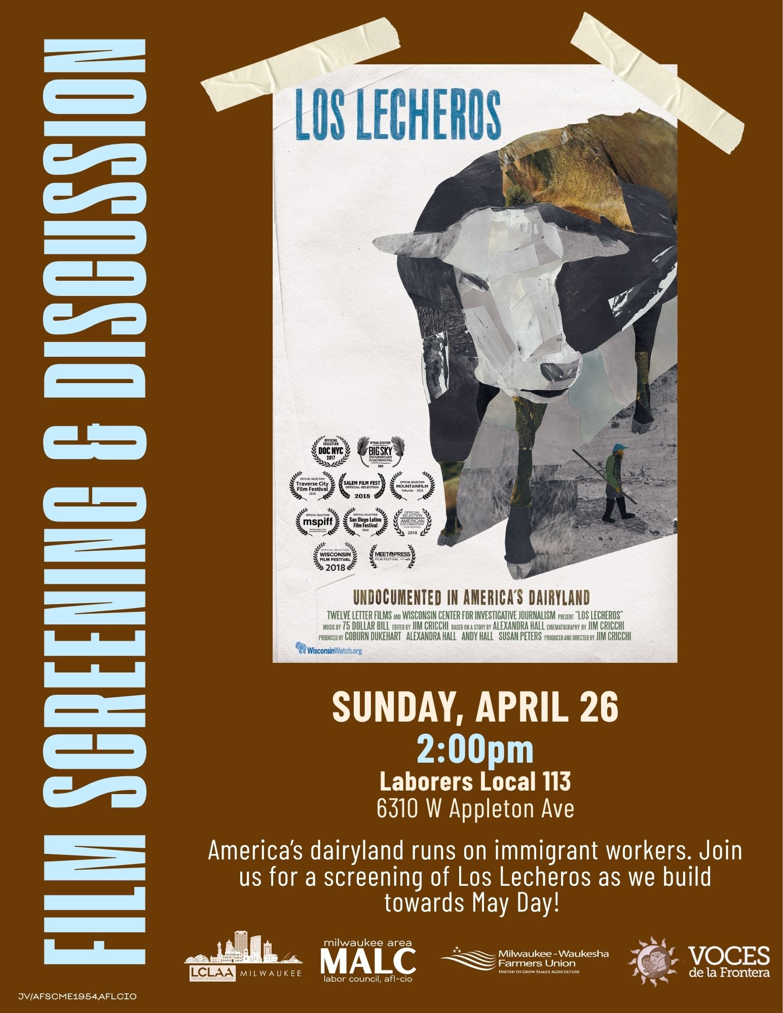 MALC, LCLAA Milwaukee, Milwaukee-Waukesha Farmers Union, and Voces de la Frontera are collaborating for the film screening of Los Lecheros, a short documentary on the undocumented workers in America’s dairyland. Following the screening we will have a discussion on worker and farmer issues. Refreshments provided.