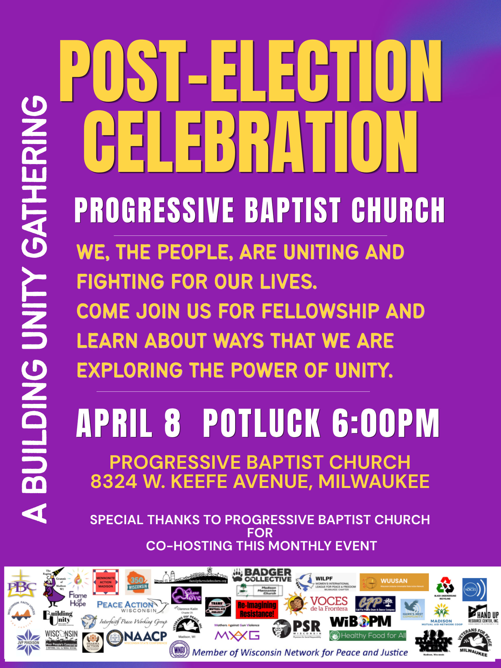 Building Unity Gatherings are mostly monthly potlucks. This month (April) our 2nd Wednesday Potluck in Milwaukee will be at a new location – Progressive Baptist Church – 8324 W. Keefe Ave. Potluck starts at 6pm – This will be a great opportunity to enjoy fellowship with others who believe it is time to unite for people, peace, and planet. Big Thanks to our Partners at PBC. This promises to be a very powerful gathering.