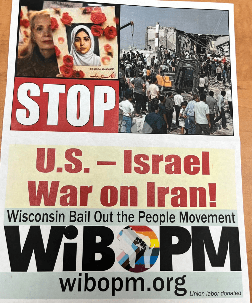 Categories Uncategorized Madison Protest April 7, 2026: Stop the U.S.-Israel War on Iran! Post author By WiBOPM Post date April 7, 2026 Stop the U.S. – Israel war on Iran! – Free Palestine! – Protest action in Madison 4/7/26 at 6 pm, Wisconsin Avenue and West Dayton Street (across from the Concourse Hotel), Madison, WI Share this: Share on X (Opens in new window) X Share on Facebook (Opens in new window) Facebook Like Loading... Related ← May Day 2026 Milwaukee & Madison → Madison, April 8, 2026: STOP THE U.S.-ISRAEL WAR ON IRAN! – FREE PALESTINE! – PEOPLE’S NEEDS NOT ENDLESS WARS!