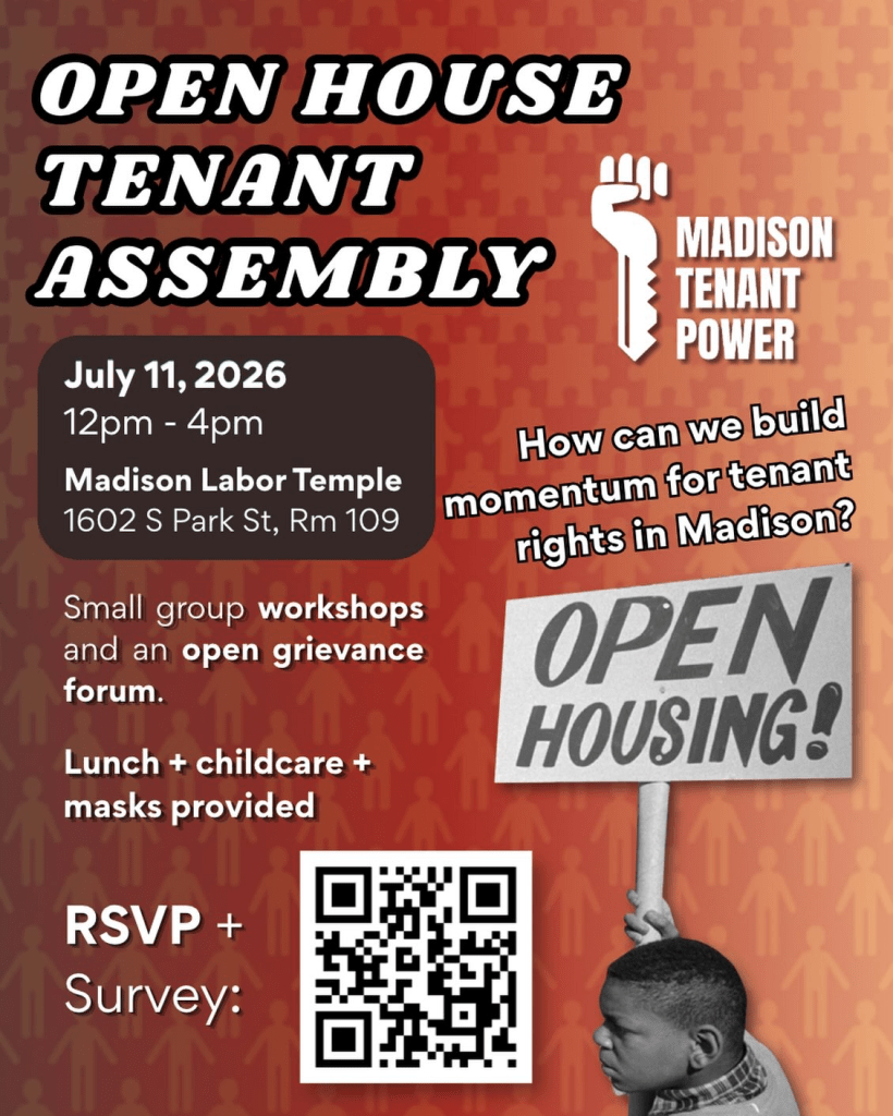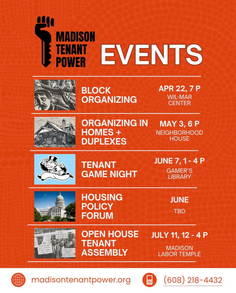 Categories Uncategorized Madison Tenant Power Events April – July 2026! – Housing Is A Human Right! Post author By WiBOPM Post date April 12, 2026 Madison Tenant Power Madison Tenant Power Share this: Share on X (Opens in new window) X Share on Facebook (Opens in new window) Facebook Like Loading... Related ← April 13-18, 2026: Apartheid Week at UW Madison! → Outpouring of Support for Salah Sarsour as Hundreds Line Memorial Drive in Milwaukee Demanding Freedom From ICE Concentration Camp (Photos)