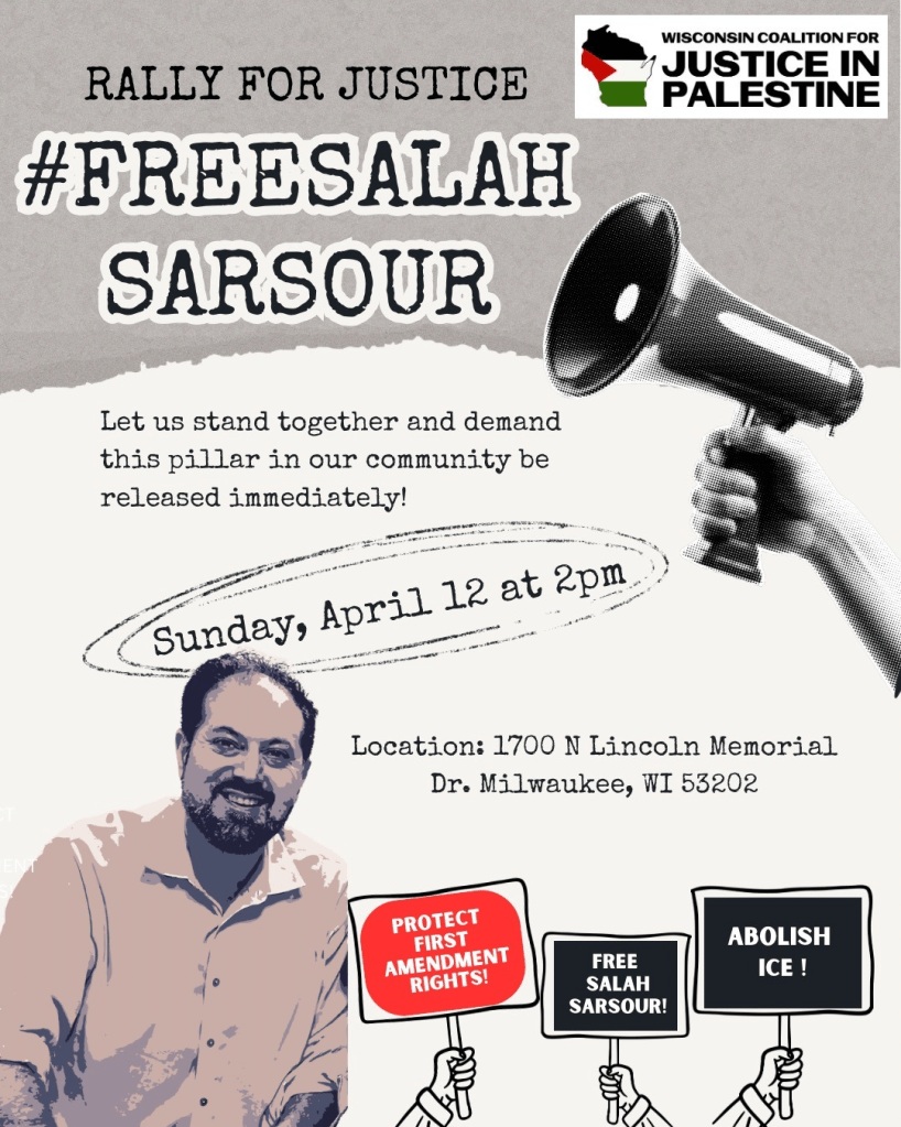 Categories Uncategorized Rally For Justice! Free Salah Sarsour! April 12, 2026 in Milwaukee Post author By WiBOPM Post date April 12, 2026 Share this: Share on X (Opens in new window) X Share on Facebook (Opens in new window) Facebook Like Loading... Related ← Racine, April 11, 2026: Stand For Peace! → Milwaukee, April 14, 2026: Abolish ICE Picket!