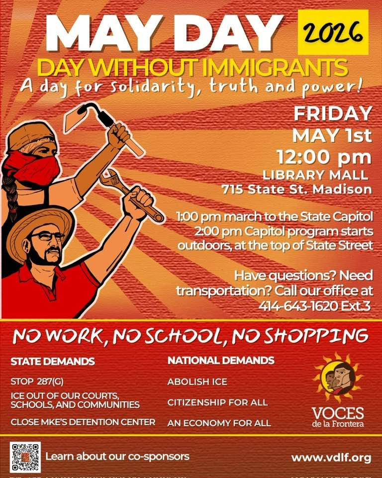 Categories Uncategorized May Day 2026, Madison Post author By WiBOPM Post date April 13, 2026 Voces de la Frontera Share this: Share on X (Opens in new window) X Share on Facebook (Opens in new window) Facebook Like Loading... Related ← OutFront Minnesota → Milwaukee, April 18-19, 2026: Voces de la Frontera Art Build for May Day!