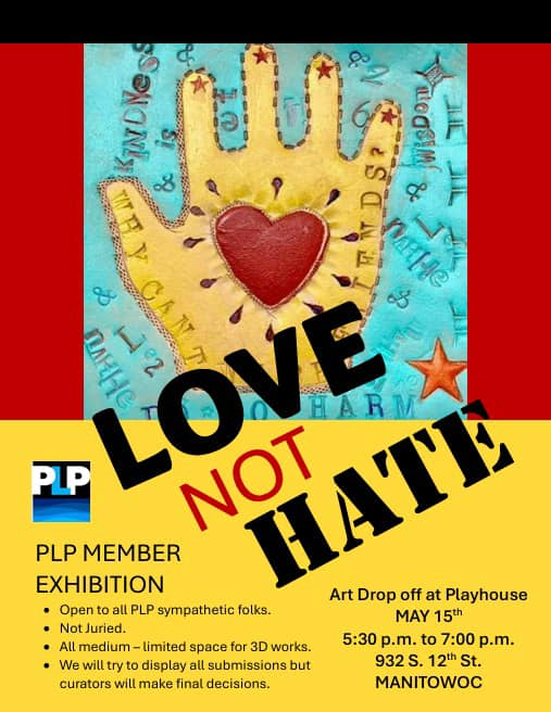 Categories Uncategorized Manitowoc, ‘Love Not Hate’ Art Exhibition May 15, 2026 Post author By WiBOPM Post date April 15, 2026 https://www.progressivelakeshorepeople.org/ Share this: Share on X (Opens in new window) X Share on Facebook (Opens in new window) Facebook Like Loading... Related ← War Resisters Say NO to Endless War! – Tax Day Event April 15, 2026 in Madison → Day of Action for Salah Sarsour April 19, 2026! – Organize. Mobilize. Demand His Release