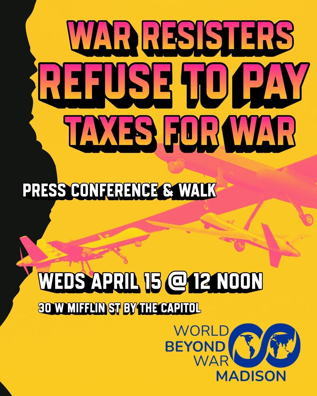Madison, Wisconsin – This Tax Day, Wednesday, April 15th, Madison for a World BEYOND War, Veterans For Peace, and allies will hold a press conference to protest how taxpayers are footing the bill for barbaric wars. They will deliver letters of objection to their members of Congress and talk about their actions as war tax resisters. They call on the public to join them in resisting the system that funnels half of the federal discretionary budget into war.