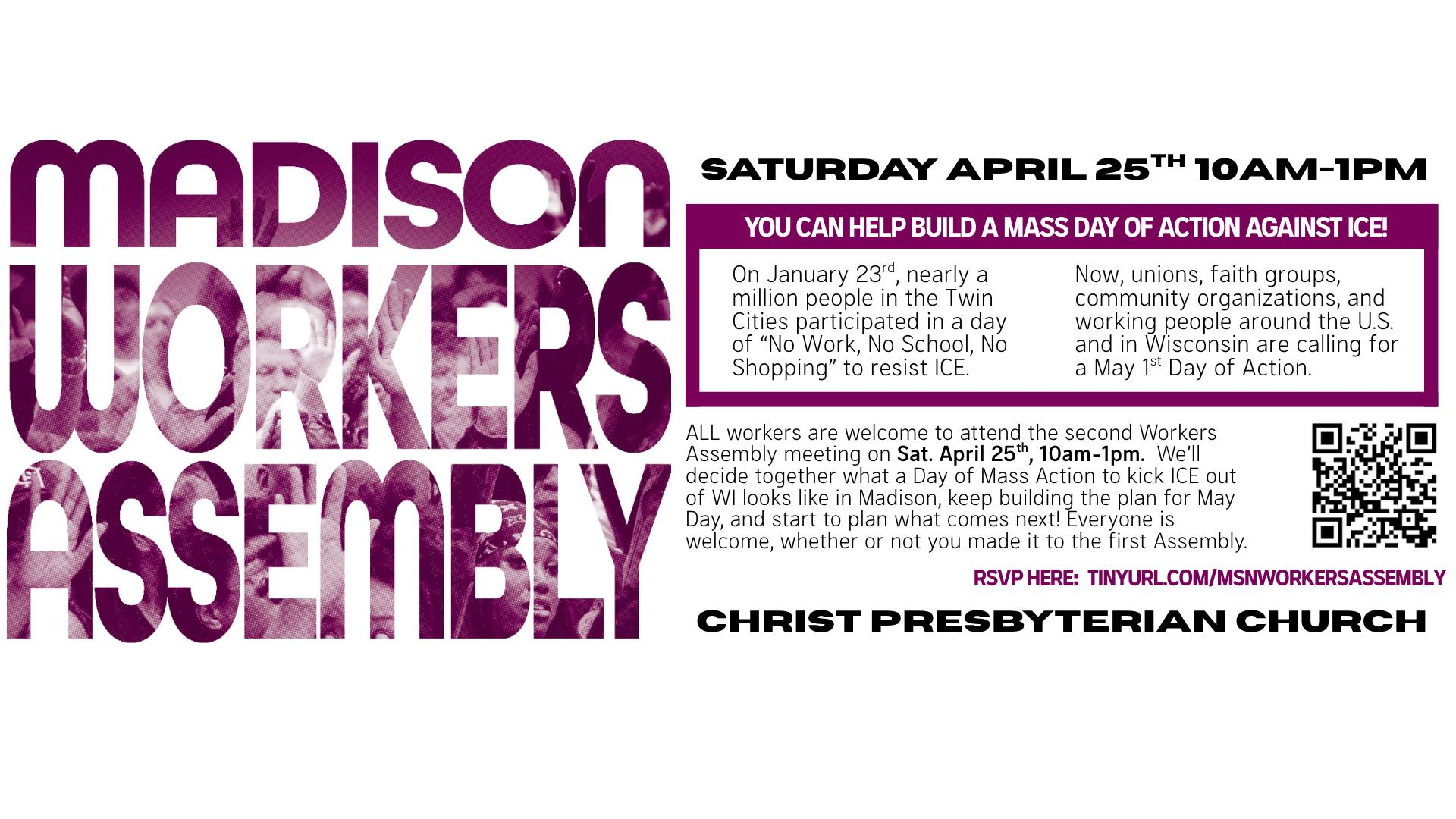 Categories Uncategorized Madison Workers Assembly April 25, 2026 Post author By WiBOPM Post date April 16, 2026 Share this: Share on X (Opens in new window) X Share on Facebook (Opens in new window) Facebook Like Loading... Related ← Madison, April 18, 2026: Potluck for People, Peace & Planet! → It’s On in WI!: All Out for May Day 2026 in Milwaukee, Madison, Janesville, Manitowoc (Art Builds, Phone Banking, Fundraisers & More)…