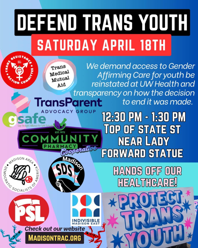 Categories Uncategorized Madison, Defend Trans Youth! Rally April 18, 2026 Post author By WiBOPM Post date April 17, 2026 Trans Resistance Action Committee Share this: Share on X (Opens in new window) X Share on Facebook (Opens in new window) Facebook Like Loading... Related ← Madison, Wis: WI Bail Out the People Movement 15th anniversary celebration, April 25 → Fort Atkinson, May 2, 2026: Authentically Us: A Celebration of LGBTQIA + Youth & Resource Fair