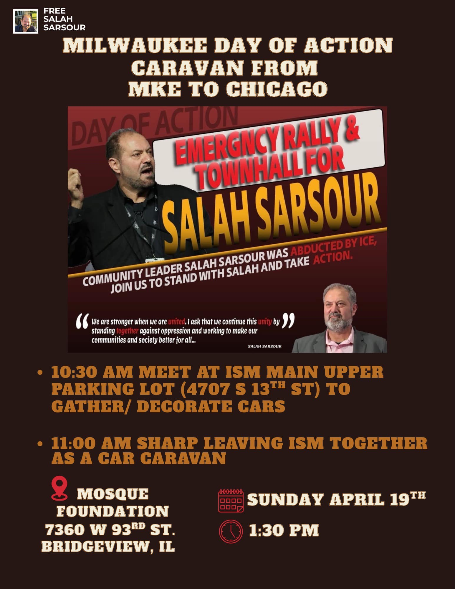 Categories Uncategorized Milwaukee to Chicago Caravan for Rally & Town Hall April 19, 2026 Post author By WiBOPM Post date April 17, 2026 Islamic Society of Milwaukee Share this: Share on X (Opens in new window) X Share on Facebook (Opens in new window) Facebook Like Loading... Related ← Fort Atkinson, May 2, 2026: Authentically Us: A Celebration of LGBTQIA + Youth & Resource Fair