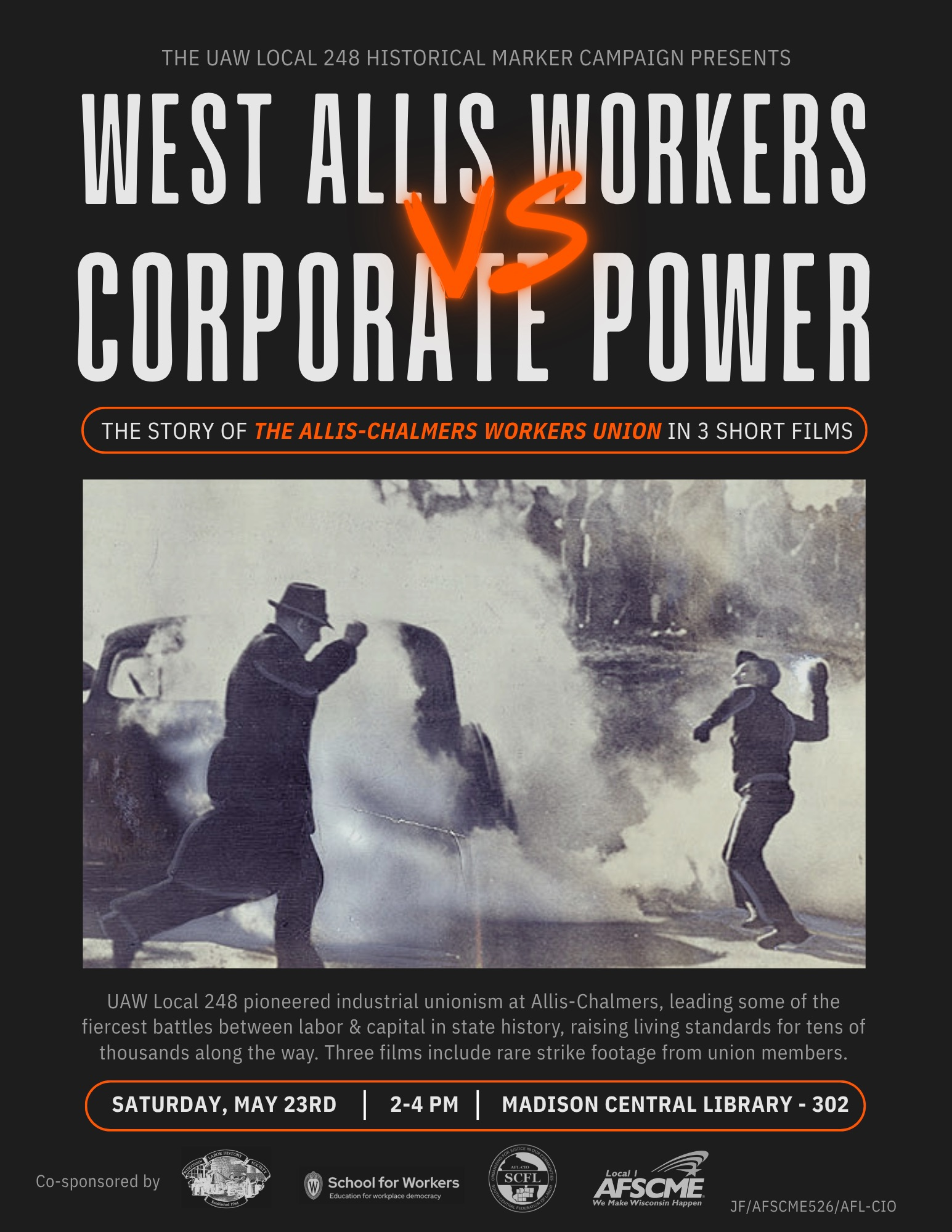 Union members working to establish a historical marker for the mighty UAW Local 248 at the former Allis-Chalmers site will host a film screening of three rare films about the union at the Madison Central Public Library, Room 302 on Saturday May 23rd from 2-4pm. The films include historic strike footage and interviews made by union activists and leaders from some of the state’s fiercest labor battles. The event is free and open to all.