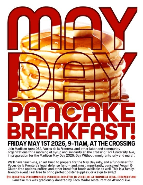 Categories Uncategorized May Day 2026 Pancake Breakfast in Madison Post author By WiBOPM Post date April 20, 2026 Share this: Share on X (Opens in new window) X Share on Facebook (Opens in new window) Facebook Like Loading... Related ← Madison, May 23, 2026: West Allis Workers Versus Corporate Power – The Story of the Allis-Chalmers UAW Union → Wisconsin: GET READY FOR MAY DAY 2026: No Work. No School. No Shopping. A Day of Truth, Solidarity, and Power! (Resources)