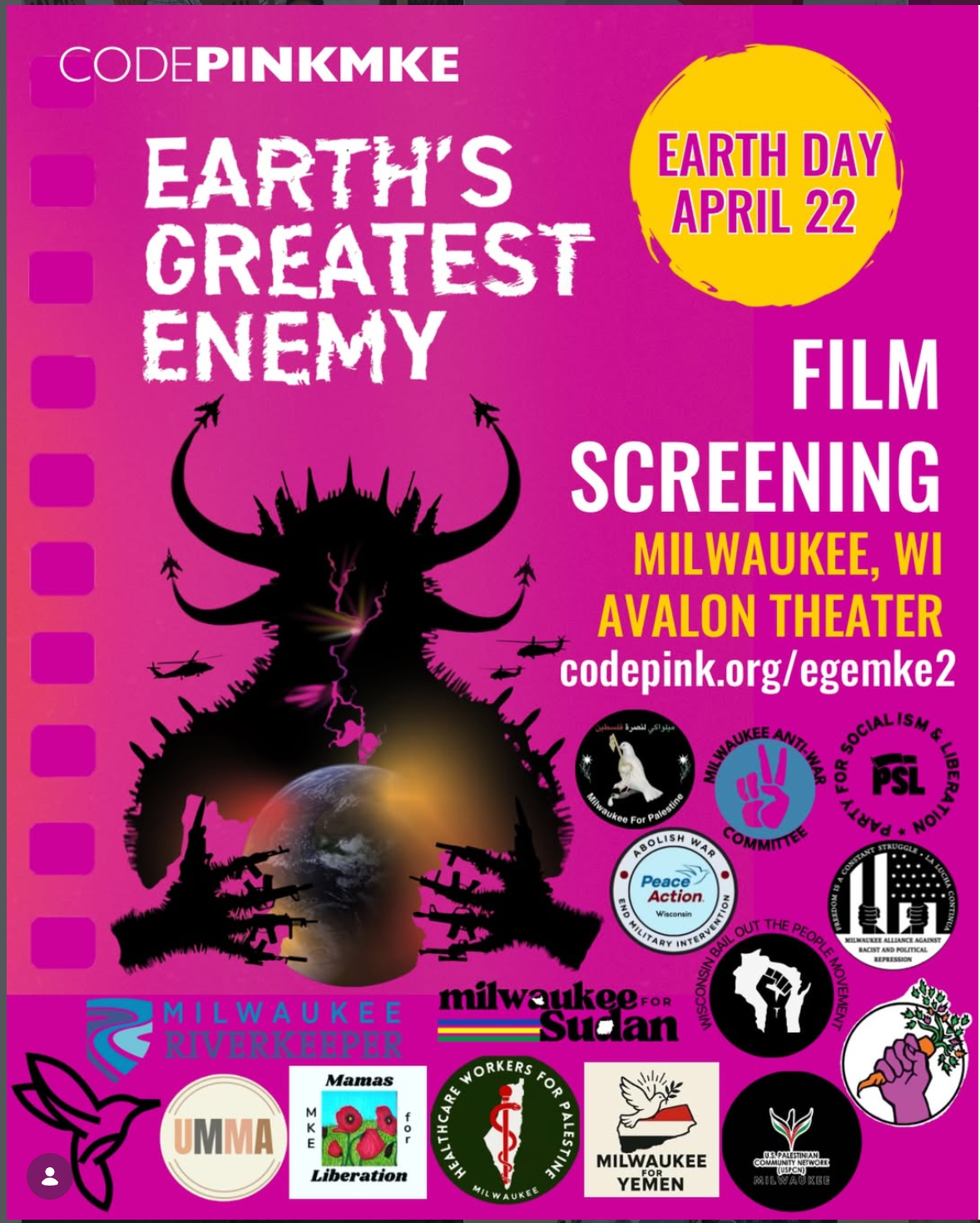 This week we are co-sponsoring CodePink Milwaukee’s Earth Day film screening of Abby Martin’s Earth’s Greatest Enemy, which reveals how the US military, as the world’s largest polluter, impacts the environment while operating with minimal accountability.