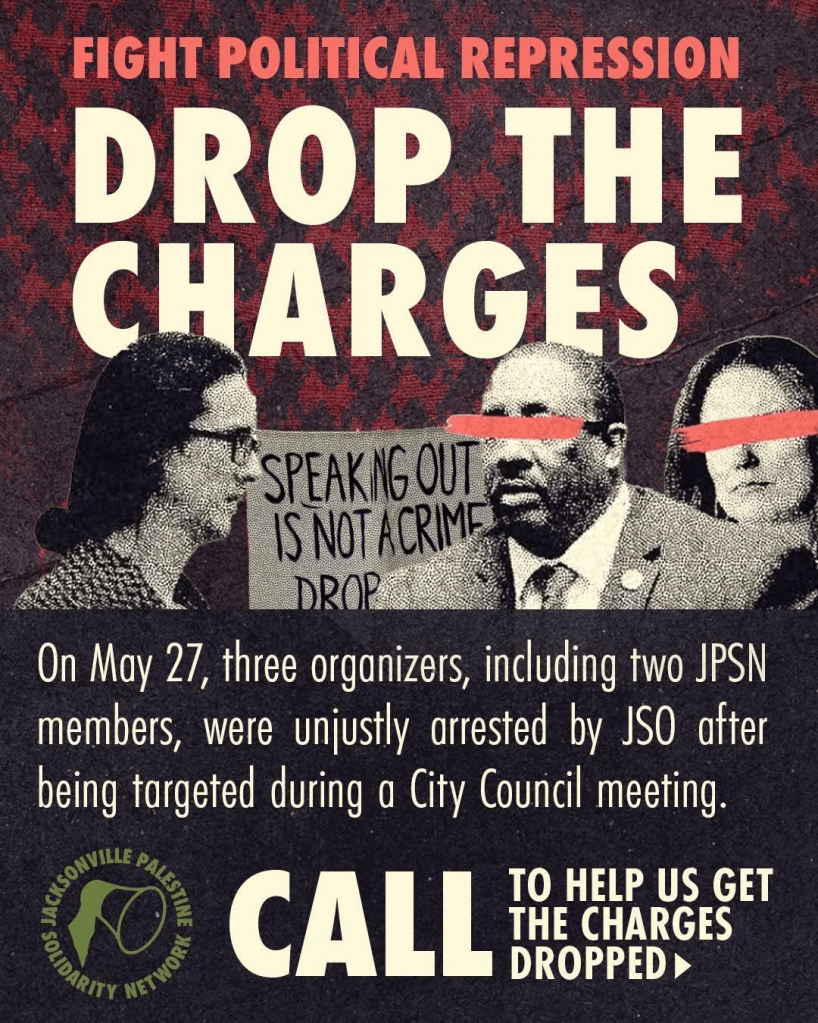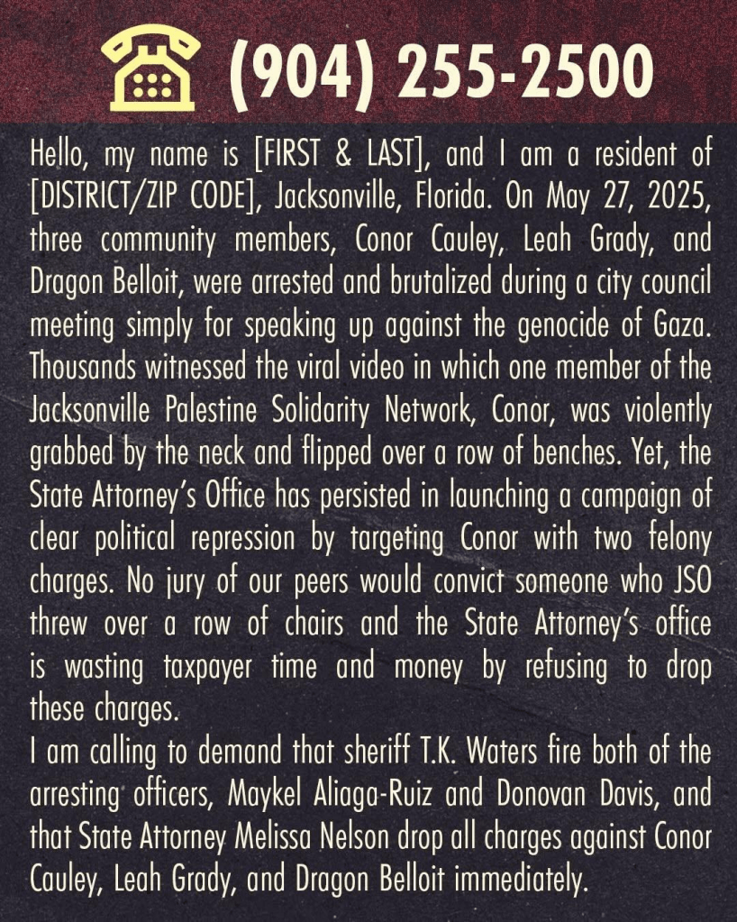 | On April 22, Call in to drop the Charges on Conor Cauley! Fight Political Repression! The Committee to Stop FBI Repression is circulating the following call to action from Jacksonville Palestine Solidarity Network. On May 27, 2025, three organizers, including two Jacksonville Palestine Solidarity Network members, were unjustly arrested by the Jacksonville Sheriff’s Office (JSO) after being targeted during a city council meeting. Conor Cauley was violently attacked by JSO officers, and is facing up to 10 years in prison for felony charges of resisting arrest with violence and battery of a law enforcement officer. Activists Leah Grady and Dragon Belloit were also arrested. Videos of the arrest clearly show that the only violence came from JSO officers. These are trumped-up, bogus charges. Sheriff T.K. Waters publicly stated he wants to make an example out of these activists in order to silence people who use their right to protest Jacksonville’s involvement in the genocide of Palestinians. With one week to go before Conor’s trial, we need to be louder than ever to demand that these charges get dropped. Every single call helps! On Wednesday, April 22, please call and email the office of State Attorney Melissa Nelson and Prosecutor Kelli Lynn Shobe: 1. Call (904) 255-2500 2. Press 0 to reach the front desk and ask to leave a message. 3. You can email them at SAO4th@coj.net and kshobe@coj.net Here is a sample script for calls or emails: “Hello, my name is [FIRST NAME, LAST NAME], and I am a resident of [CITY, STATE]. On May 27, 2025, three community members, Conor Cauley, Leah Grady, and Dragon Belloit, were arrested and brutalized during a city council meeting simply for speaking up against the genocide of Gaza. Thousands witnessed the viral video in which one member of the Jacksonville Palestine Solidarity Network, Conor, was violently grabbed by the neck and flipped over a row of benches. Yet, the State Attorney’s Office has persisted in launching a campaign of clear political repression by targeting Conor with two felony charges. No jury of our peers would convict someone who JSO threw over a row of chairs and the State Attorney’s Ofice is wasting taxpayer time and money by refusing to drop these charges. I am calling to demand that sheriff T.K. Waters fire both the arresting officers, Maykel Aliaga-Ruiz and Donovan Davis, and that State Attorney Melissa Nelson drop all charges against Conor Cauley, Leah Grady, and Dragon Belloit immediately.” |