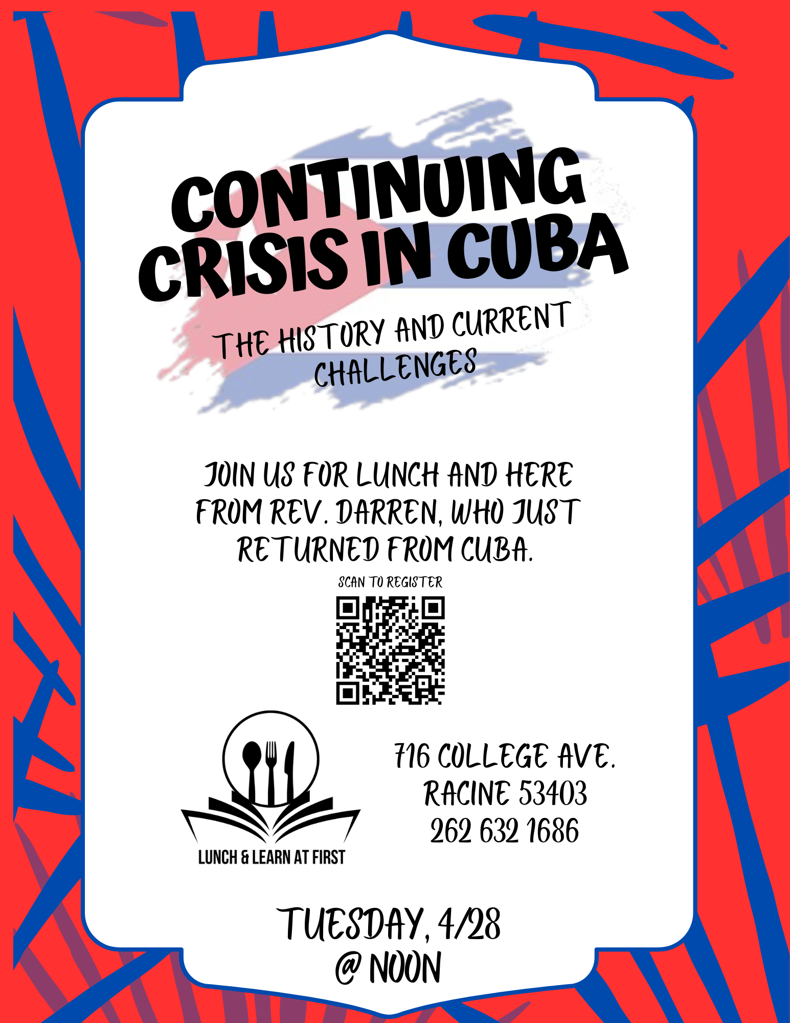 Rev. Darren Utley will be doing the LUNCH AND LEARN event at First Presbyterian Church, 716 College Avenue in Racine, on Tuesday the April 28, 2026! Cuba has been under US sanctions for many years, and sanctions/blockades kill more than wars. End the U.S. Blockade Now!