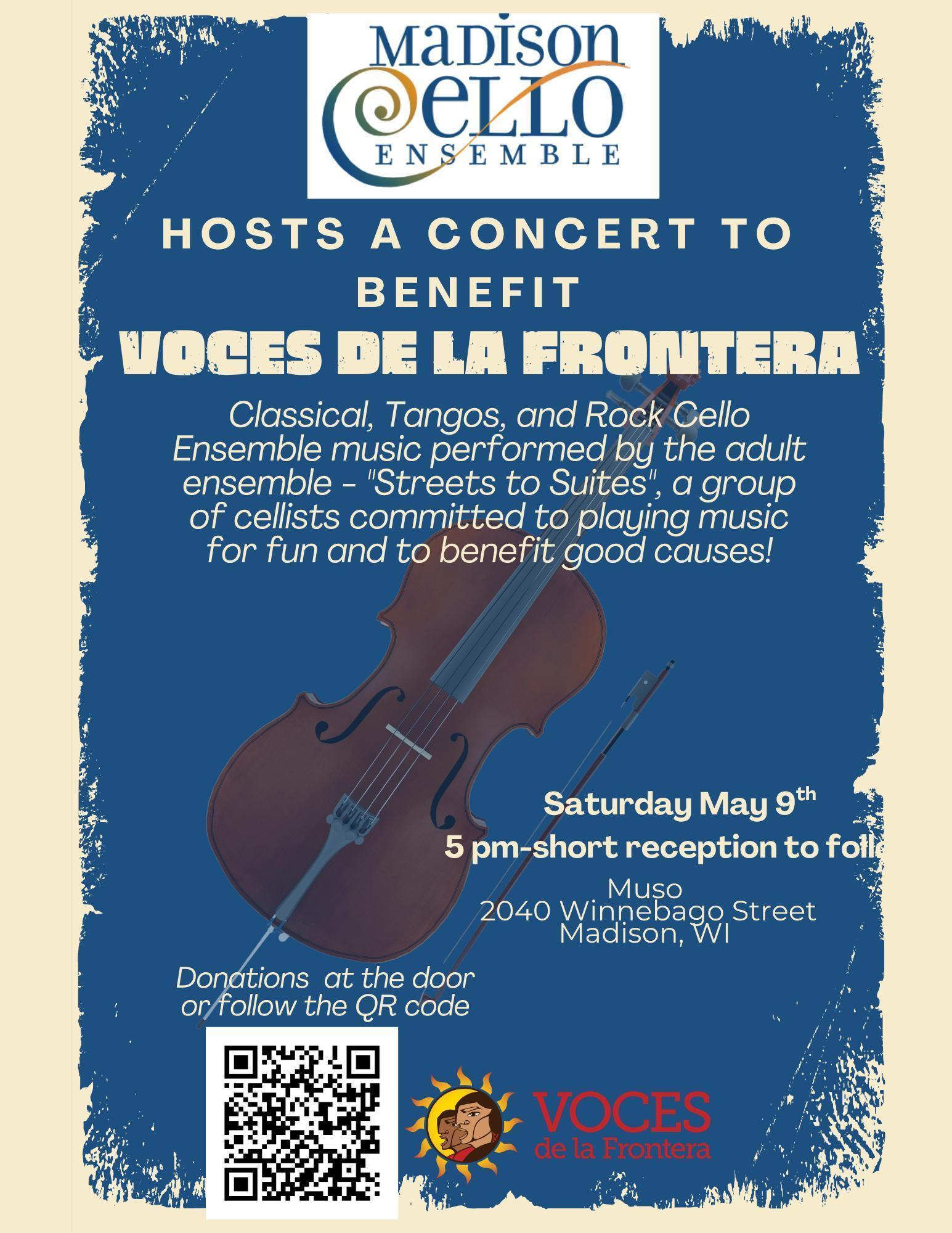 Categories Uncategorized Madison, May 9, 2026: Madison Cello Ensemble Benefit Concert for Voces de la Frontera Post author By WiBOPM Post date April 26, 2026 Share this: Share on X (Opens in new window) X Share on Facebook (Opens in new window) Facebook Like Loading... Related ← No Borders in the Workers’ Struggle – From the streets of Detroit to Washington D.C., Wall Street and around the world, what impacts us resounds around the globe → Madison, Dance Night for Human Rights May 2, 2026