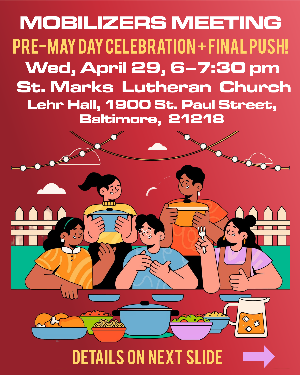 Join us for a pre-May Day Celebration at the next Mobilizers Meeting—Wednesday, April 29.