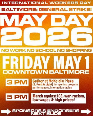 Peoples Power Assembly; Ujima People’s Progress Party; Free State Coalition; Unemployed Workers Union, Maryland; Dr. Rev Turner, Empowerment Temple; Eyes on ICE; Indivisible Baltimore City; NAACP, Towson University; Women in Struggle/Mujeres En Lucha; Veterans for Peace, Baltimore; Baltimore Club, CPUSA; World Beyond War, Baltimore; International League for People’s Struggle, Baltimore; People’s Parity Project, U of B Law School; Young Democrats of Baltimore County; Love Thy Neighbor ROMG; Urban Reads; Struggle for Socialism Party; Socialist Party, Baltimore & USA; Kermit Leibensperger, UFCW MCGEO Local 1994 Steward; Malaya Movement Baltimore; Baltimore Peace Action; Liv’s Legacy; Committee for Human Rights in the Philippines, Baltimore; Bill Goodin, Community Activist; Mark Conway, Conway for Congress; Women in Black; Prisoners Solidarity Committee; Rev CD Witherspoon; Black Alliance for Peace… and you.