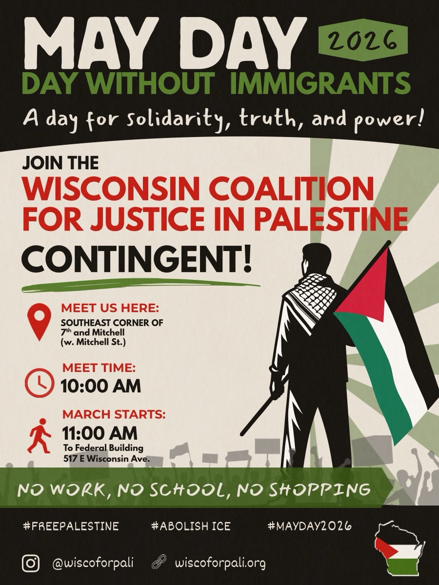 Categories Uncategorized Palestine Contingent in the May Day 2026 March in Milwaukee Post author By WiBOPM Post date April 29, 2026 Share this: Share on X (Opens in new window) X Share on Facebook (Opens in new window) Facebook Like Loading... Related ← Southern Workers Assembly: May Day 2026: Workers Over Billionaires!
